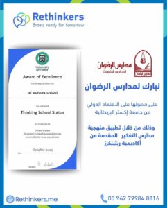 قدّمت الدكتورة لانا المبيضين، بصفتها الخبيرة الدولية المعتمدة في منهجية مدارس التفكير، الدعم والإشراف المهني لمدارس الرضوان خلال رحلة التمكين والتطوير التي استهدفت تطبيق معايير Thinking Schools بمستوى دولي. وبتاريخ 18/10/2025، حصلت مدارس الرضوان رسميًا على الاعتماد الدولي من جامعة إكستر البريطانية، تقديرًا لتميزها في بناء منظومة تعليمية تعتمد التفكير ممارسةً يومية في الصفوف.